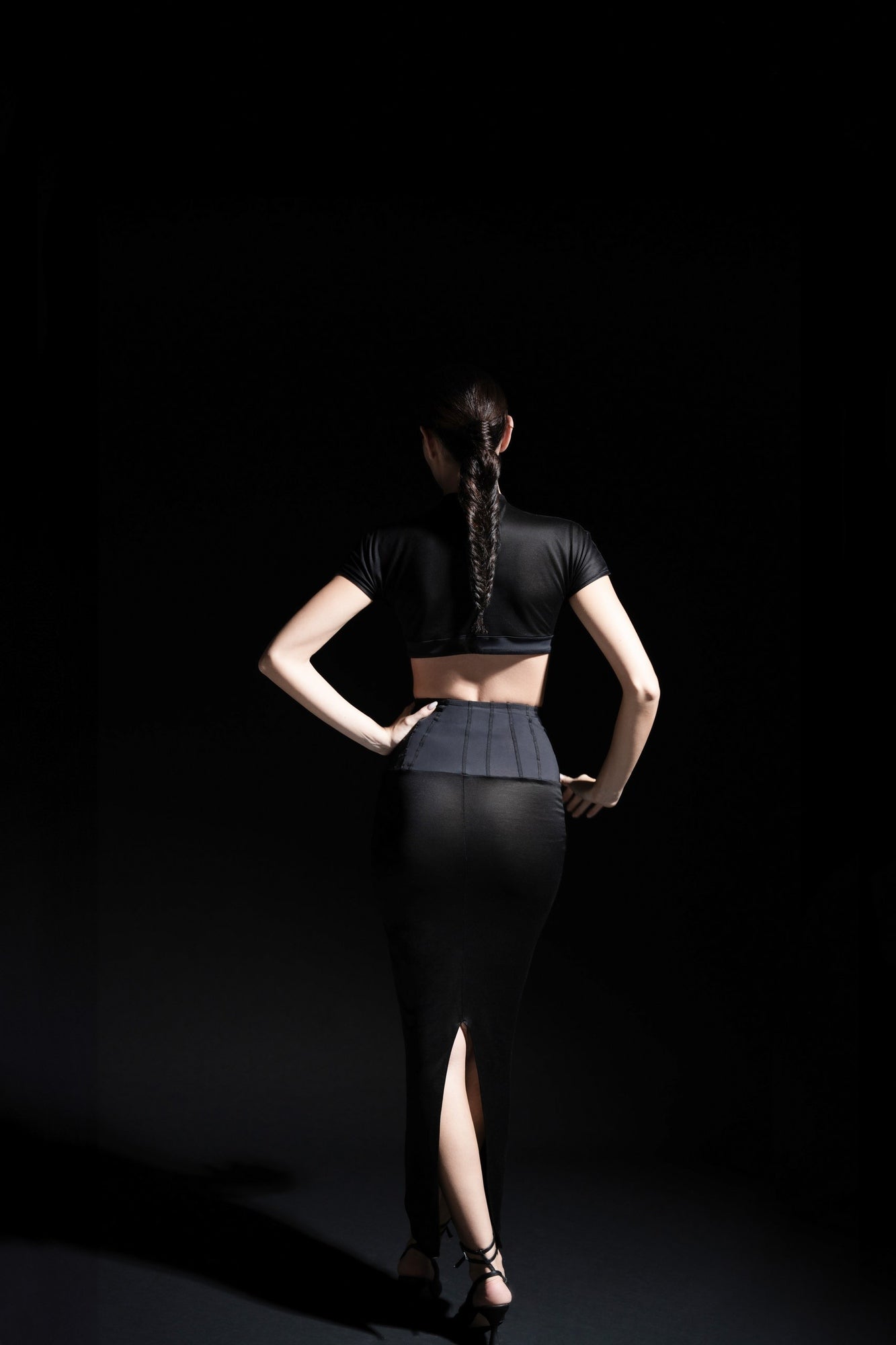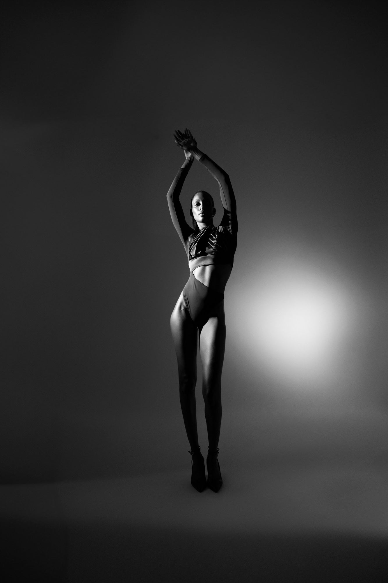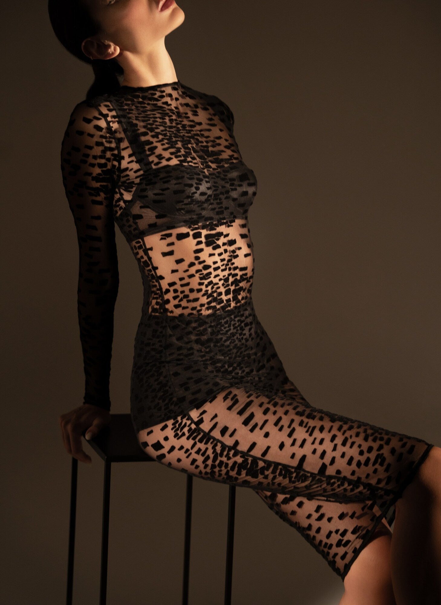The collection revolves around an exploration of black in all its shades and textures, offering a range of carefully selected materials. Transparent black, matte black, glossy black, and dark stripes intertwine, creating a captivating visual harmony. Each fabric has been chosen for its ability to capture light and interact with other textures, adding depth and intensity. Gatherings, graphic cutouts, and layered details play with transparency and opacity, subtly revealing the silhouette and creating a second-skin effect.